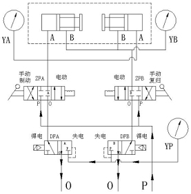 、當(dāng)制動(dòng)電磁閥(正面左)通電,復(fù)歸電磁閥(正面右)不通電;壓力氣從P腔進(jìn)入電磁閥到手動(dòng)轉(zhuǎn)閥至工作腔A,工作腔B通向O,實(shí)現(xiàn)自動(dòng)制動(dòng);制動(dòng)電磁閥失電,制動(dòng)腔氣體從0腔排出。