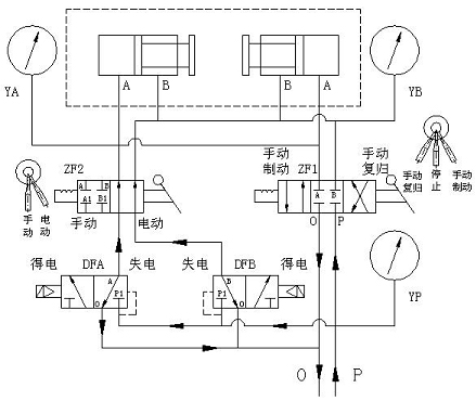 1、自動回路:將手動轉(zhuǎn)閥ZF1的手柄扳到停止位置,手動轉(zhuǎn)閥ZF2的手柄扳到電動位置,壓縮空氣進(jìn)入電磁換向閥DFA、DFB的壓力腔(進(jìn)氣腔),并密封在壓力腔內(nèi),左、右工作腔與排氣腔接通。