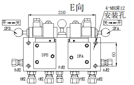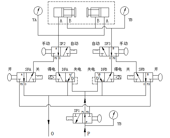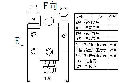 自動剎車:電磁閥線圈處于失電狀態(tài),手拉閥SF1、SF2、SF3往里推至自動狀態(tài),過濾后壓縮氣體從進氣腔(P腔)進入集成塊。當接收到停機指令時,制動電磁閥DFA得電開閥,使壓縮氣體進入制動腔(A腔), 從而實現(xiàn)對制動器的投入, 加速機組的制動停機;